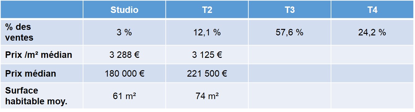 * Le prix médian : la moitié des transactions ont été signées à un prix inférieur et l’autre moitié à un prix supérieur. L’avantage de la médiane comme mesure de tendance centrale est qu’elle n’est pas influencée par les valeurs extrêmes.